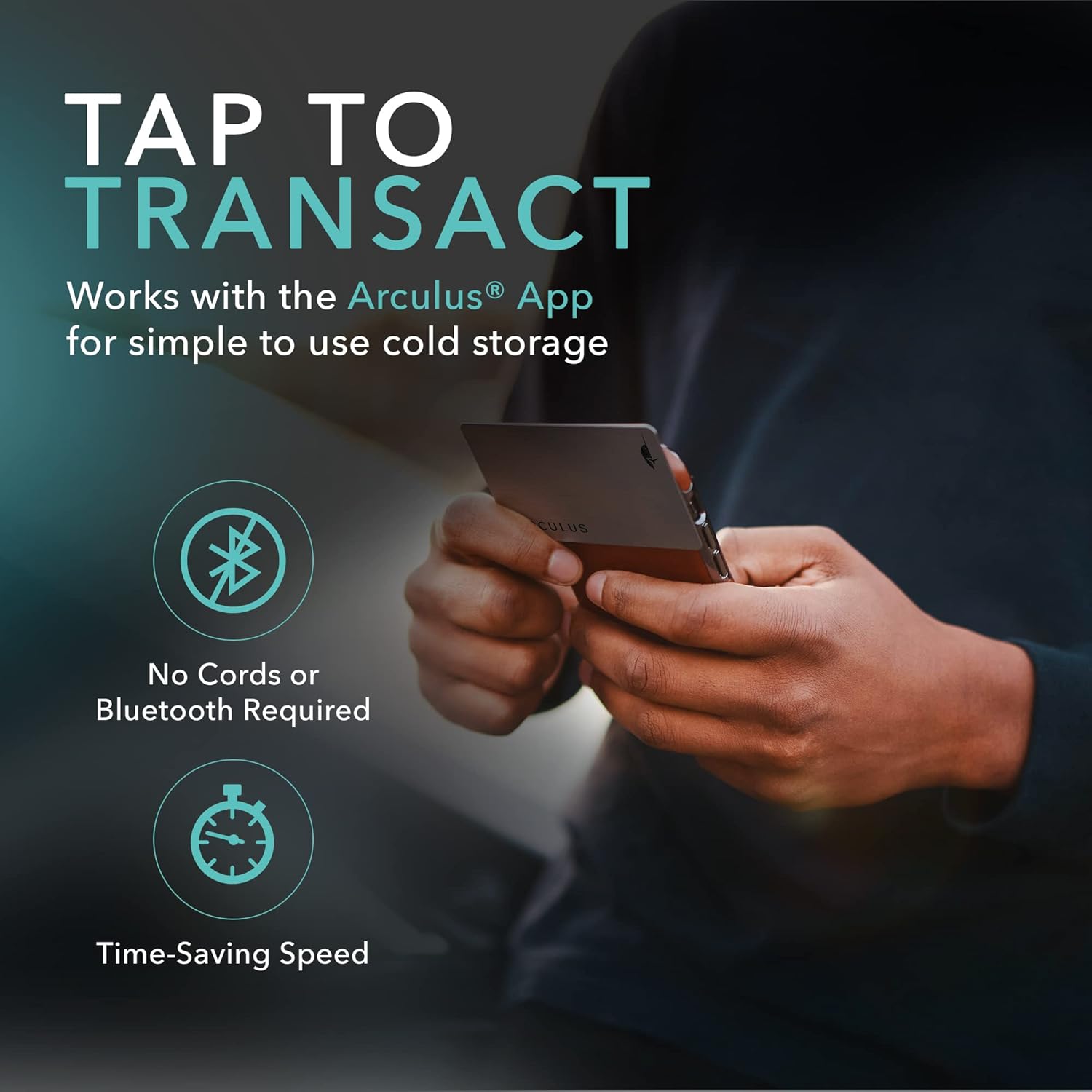 The Arculus Cold Storage Wallet connects with your phone using secure tap-to-transact NFC technology. Experience next-gen security without the need for cords, connections, or an internet connection.