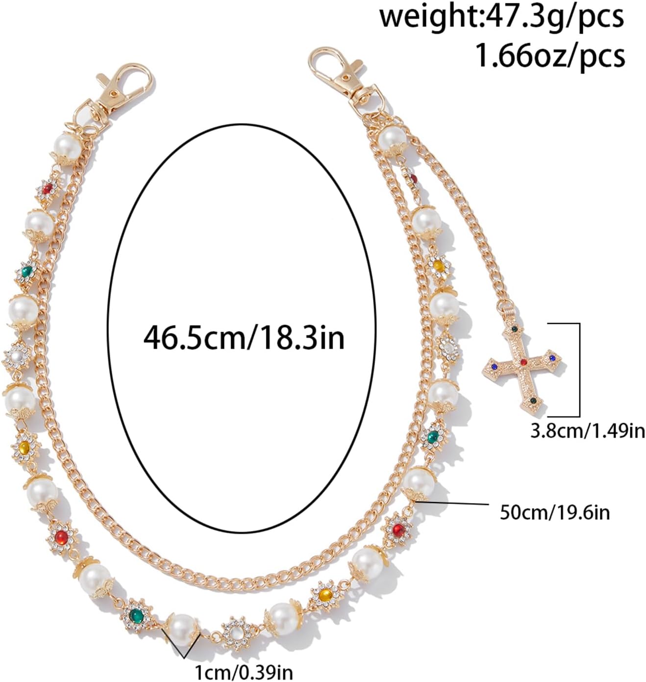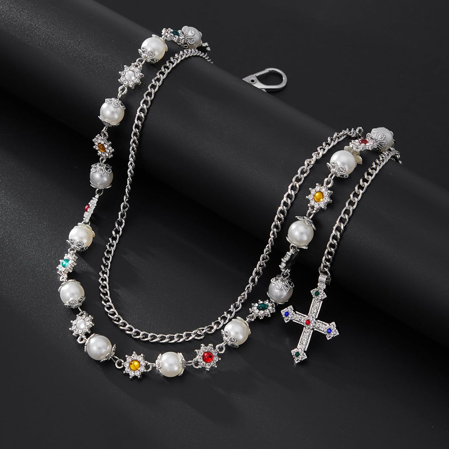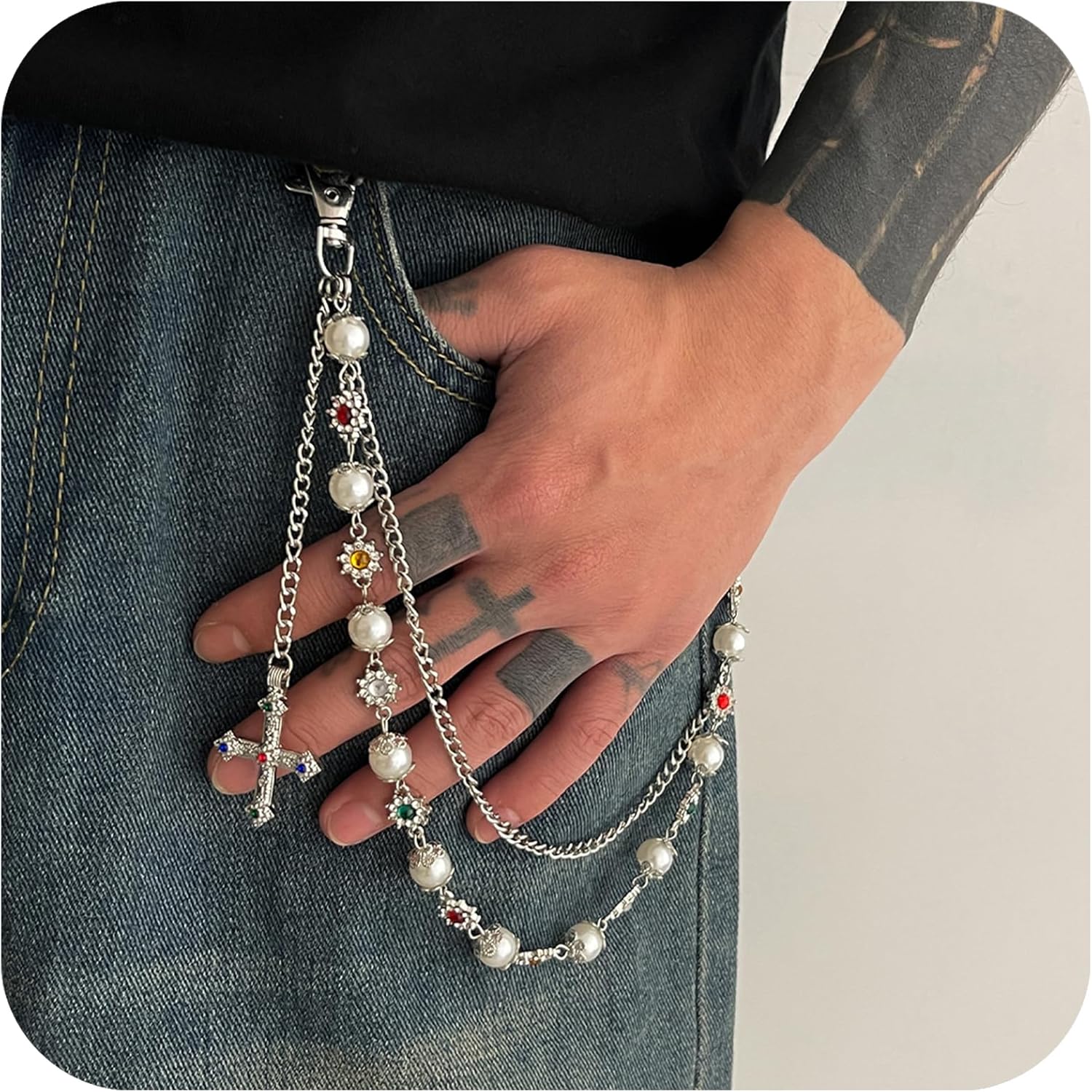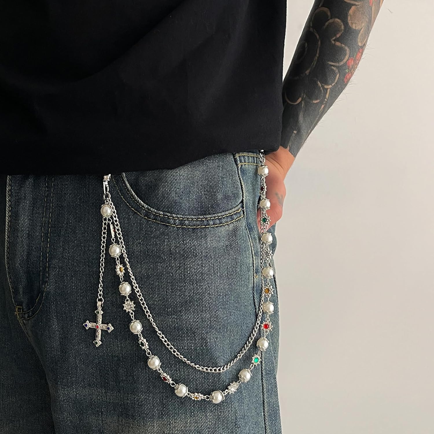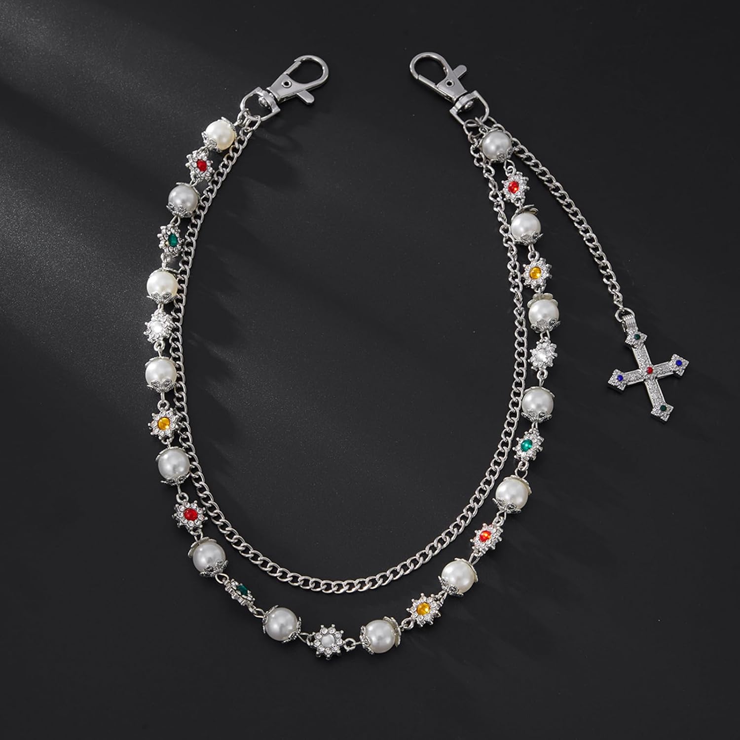 The intricate layered design not only adds dimension and movement but also ensures that this piece stands out in your accessories collection. Whether you’re looking to enhance casual denim or add an edgy touch to your evening outfit, these wallet chains serve as both functional and decorative elements. The detailed flower embellishments and pearl accents transform each chain into a unique piece of wearable art, beautifully catching the light as you move.