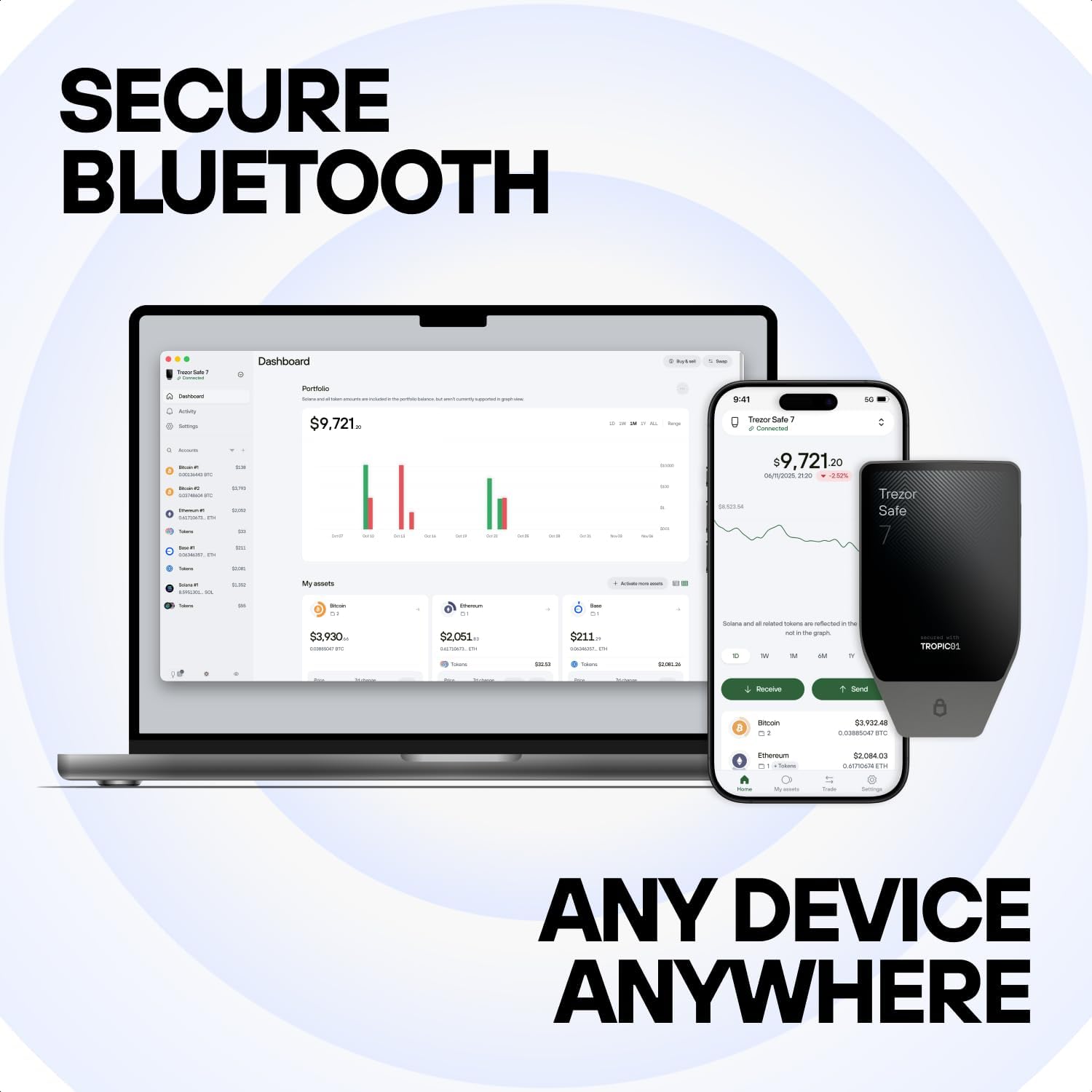 - Secure Wireless Connectivity: Features the Trezor Host Protocol for encrypted Bluetooth and USB-C connections, ensuring that unknown devices cannot connect.